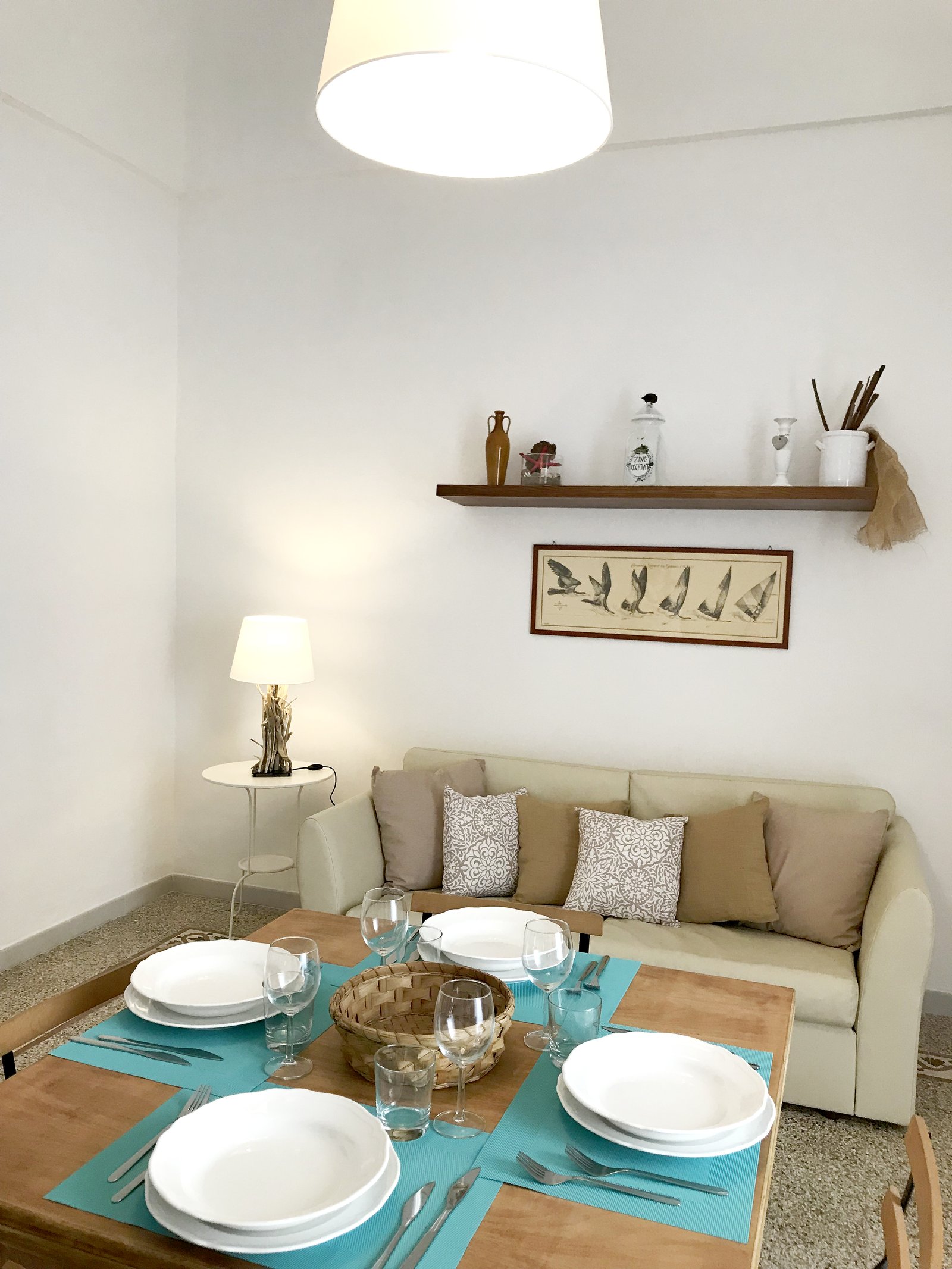 Nell’ampio soggiorno, molto luminoso, le tende leggere in lino dai colori chiari e naturali lasciano filtrare la luce del mattino e donano all’ambiente un tono caldo e naturale. All’ingresso il vecchio tavolo sul quale era solito lavorare il nonno del proprietario, è stato sapientemente restaurato ed utilizzato come consolle sulla quale è riposto il guest book che raccoglie tutti i pensieri della gente che lì ha trascorso momenti di felice relax. Anche il tavolo in legno massello e le sedie sono oggetti di recupero, ai quali sono stati modificati i colori per rispettare la palette scelta per questa casa. Il divano in cotone beige, vecchio stile, è accanto ad un tavolino in ferro battuto, sul quale è poggiata una lampada che è stata realizzata con legnetti recuperati in spiaggia dopo una forte mareggiata. Sulla mensola sopra il divano un vecchio albarello in vetro e vasi riempiti di conchiglie e coralli naturali.