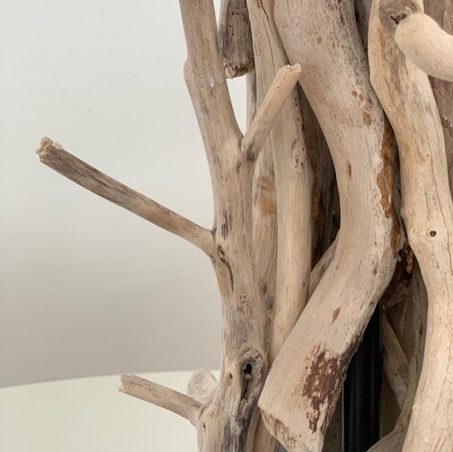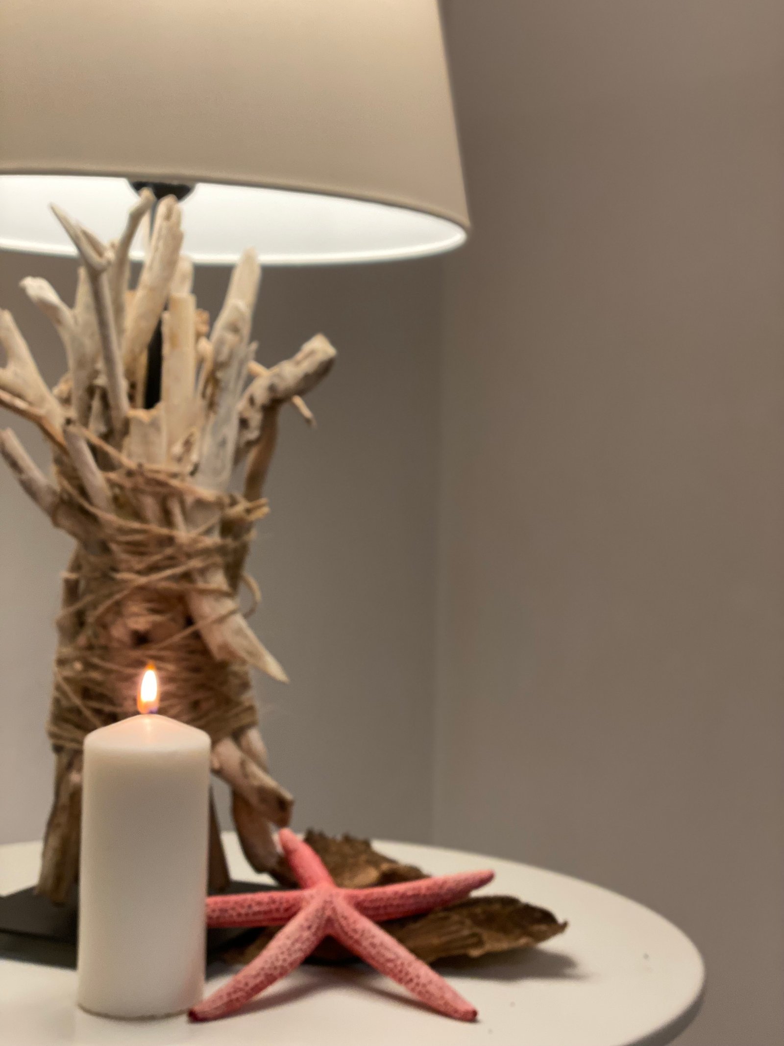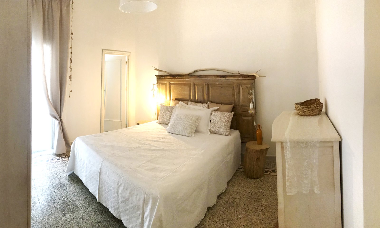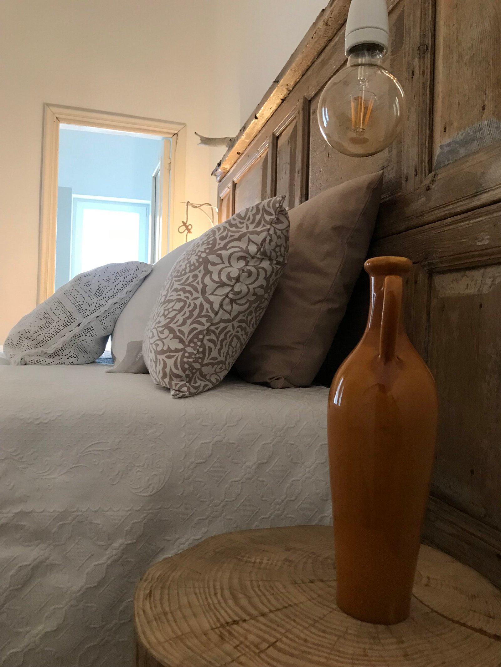 Nella camera da letto, la testata è fatta con una vecchia porta mercantile restaurata, dal fascino rustico e dal design unico sulla quale sono posizionate le abat-jour che illuminano i due comodini fatti con tronchi di pino marittimo. La biancheria è rigorosamente in lino e cotone così come le tende. Armadio e comò in legno bianco danno un senso di freschezza e luminosità.