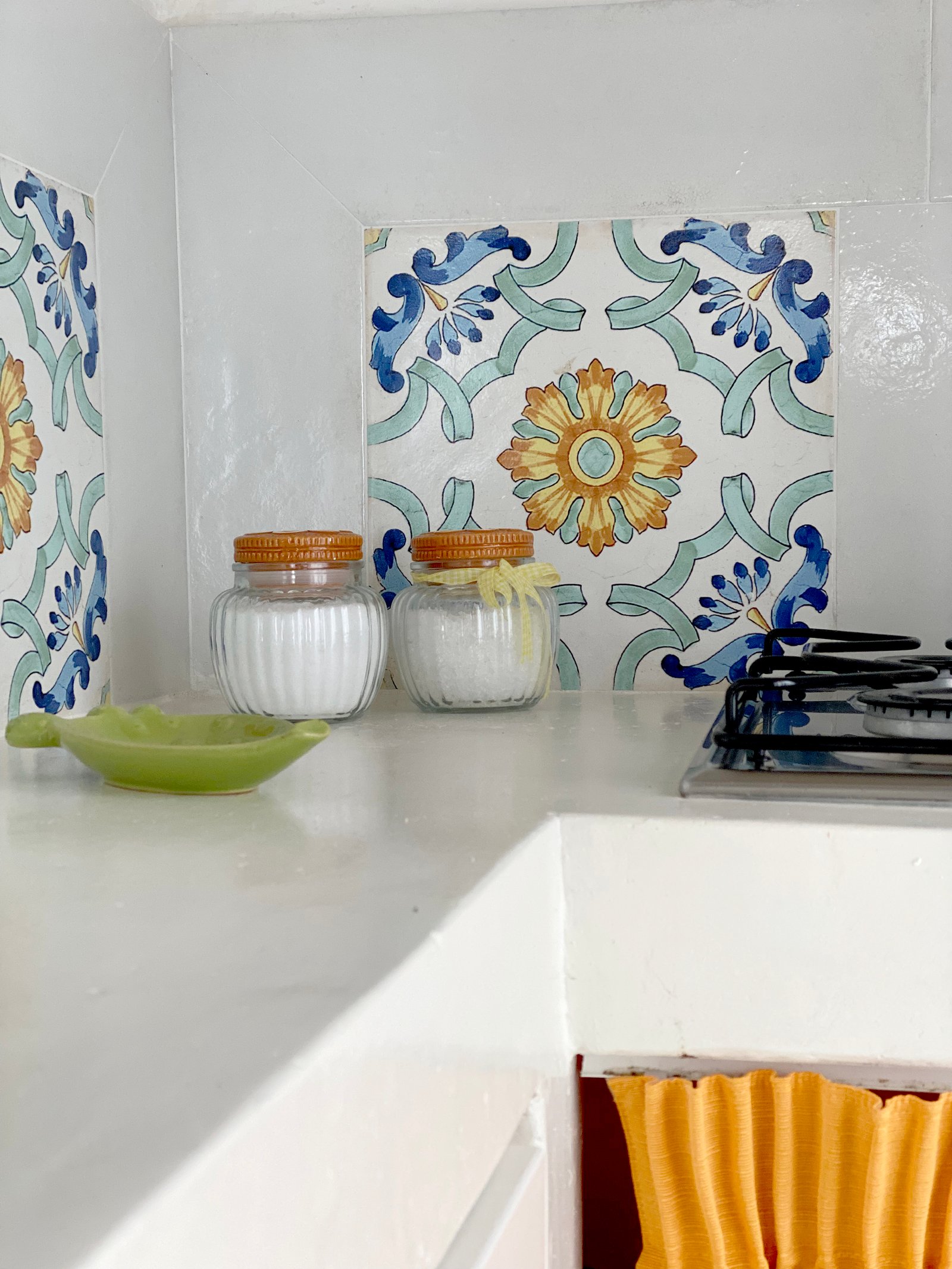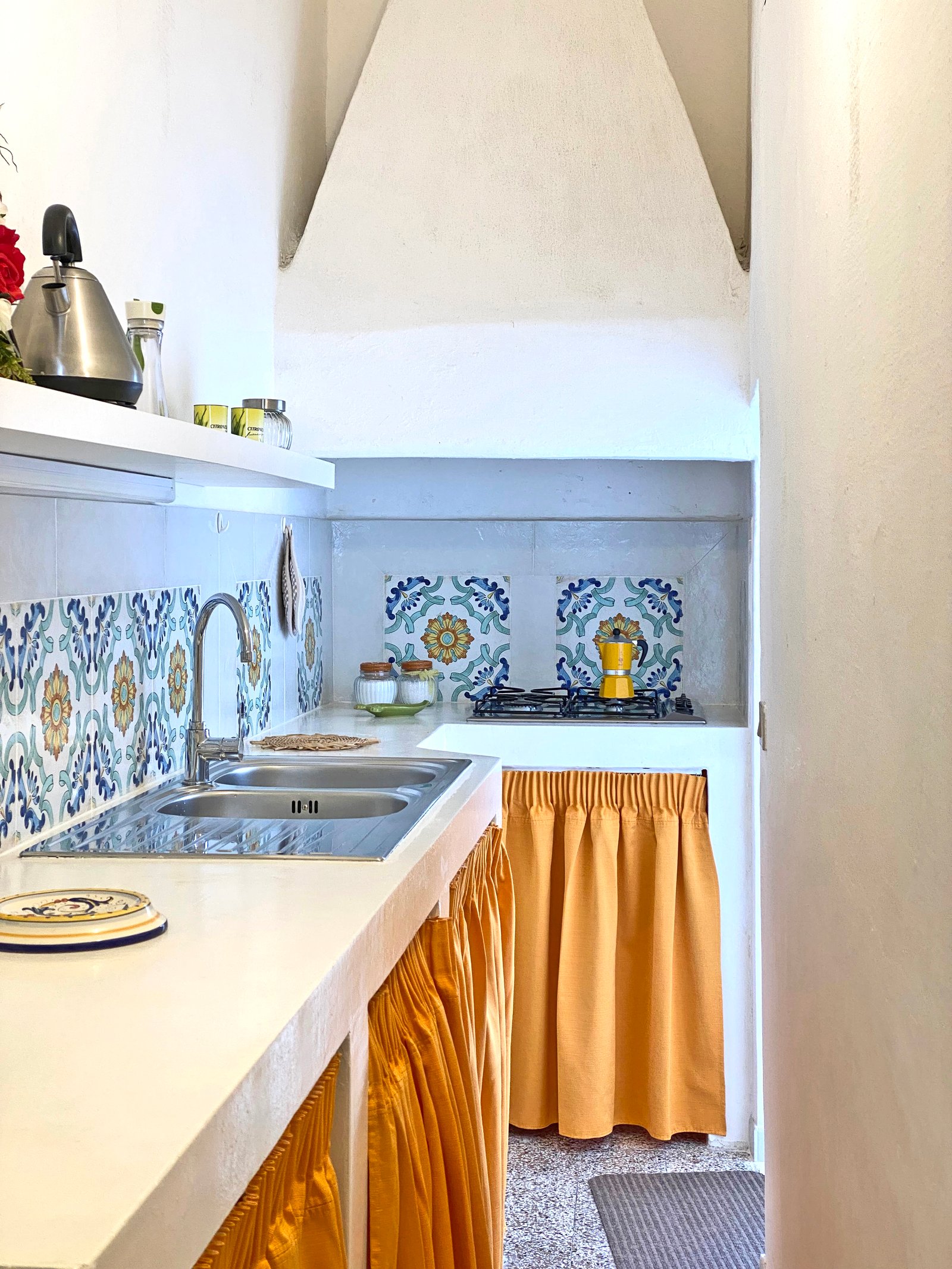 La cucina è stata la sfida più grande, viste le dimensioni esigue. Una cucina in muratura, realizzata da un artigiano locale, ha personalizzato l’ambiente. Il piano cottura è stato volutamente posizionato sotto la vecchia cappa in muratura utilizzata un tempo per cucinare. Le piastrelle in maiolica dal tipico disegno mediterraneo hanno dato un tocco di colore.