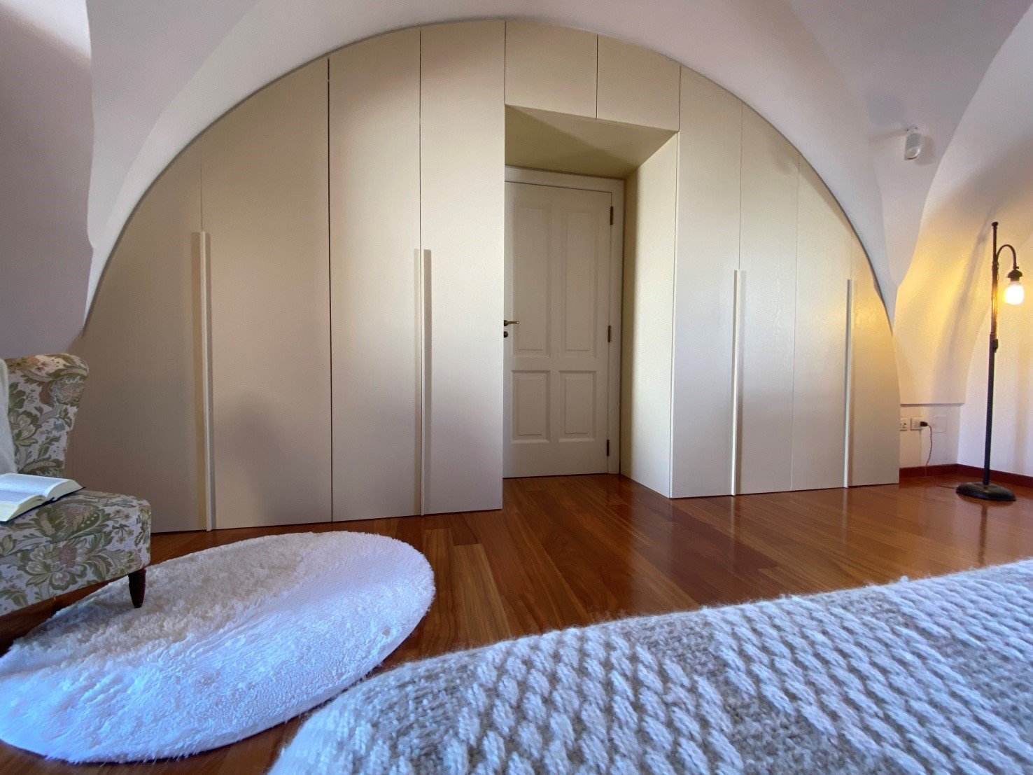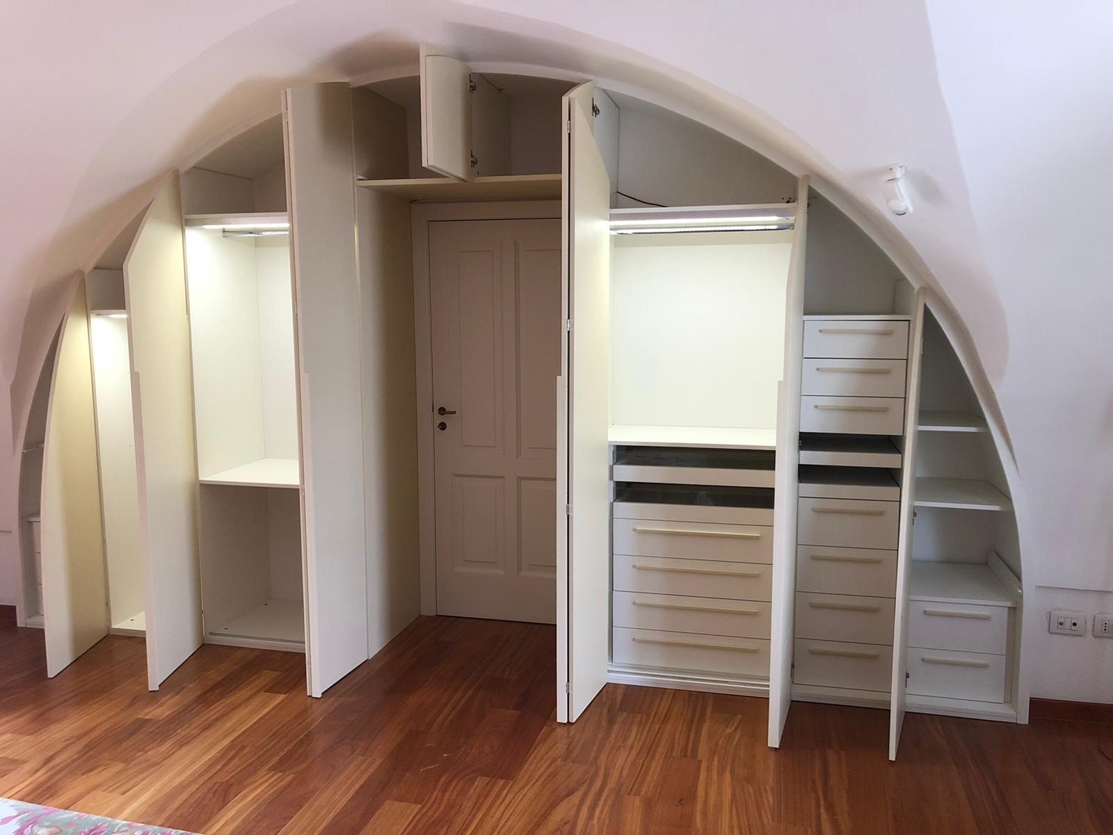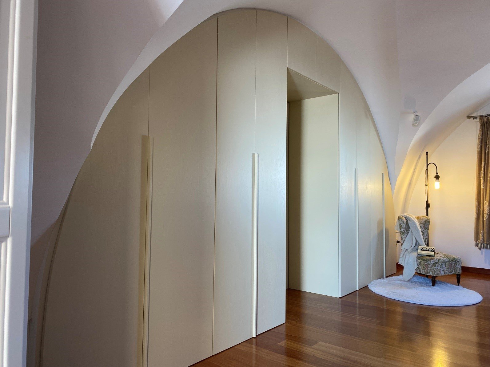E’ un armadio disegnato su misura in maniera sartoriale. In questo progetto da realizzare in un edificio storico, la particolarità dell’ambiente voltato creava difficoltà nell’utilizzo di arredi industriali, proprio perché non si sarebbe potuto sfruttare tutto lo sazio a disposizione. Bisognava confrontarsi, tra l’altro, con l’ arredo eclettico di grande pregio della casa e risultare al contempo sobrio e funzionale. La grande difficoltà era quella di creare degli spazi contenitivi su un muro che oltre ad avere come vincolo la volta, aveva anche la porta d’ingresso alla camera posizionata al centro del muro. Si è deciso, dunque, di utilizzare una struttura a ponte sagomata che potesse sfruttare ogni centimetro della parete scelta per l’armadio, che ha permesso di diventare quasi un tutt’uno con la struttura architettonica, complice anche la scelta del colore neutro. È stato realizzato in listellare di frassino e laccato a poro aperto e trattate in modo che al tatto risultasse liscio e setoso. Le ante sono a pacchetto per permettere l’apertura massima dei vani contenitori. Per facilitare la visione degli indumenti sono stati inseriti delle strip led che si accendono all’apertura delle ante. Grande attenzione è stata riposta nella scelta dei particolari degli elementi interni.Tutto questo è stato possibile anche grazie alla professionalità dell’artigiano che mi ha seguita e accompagnata in questo piccolo, ma complesso progetto, lavorando in grande sinergia.