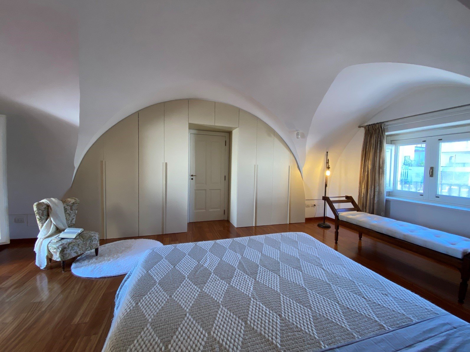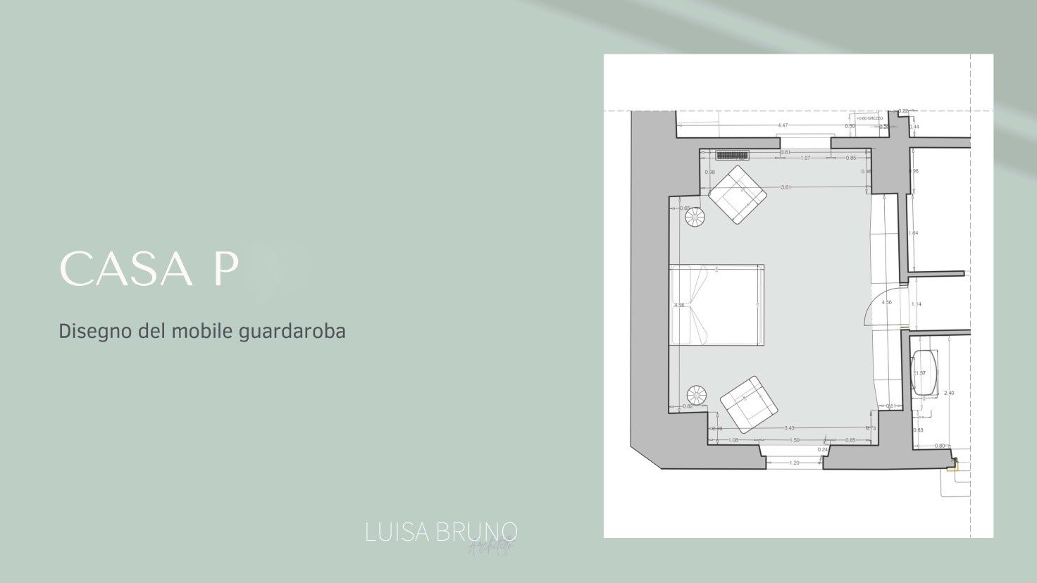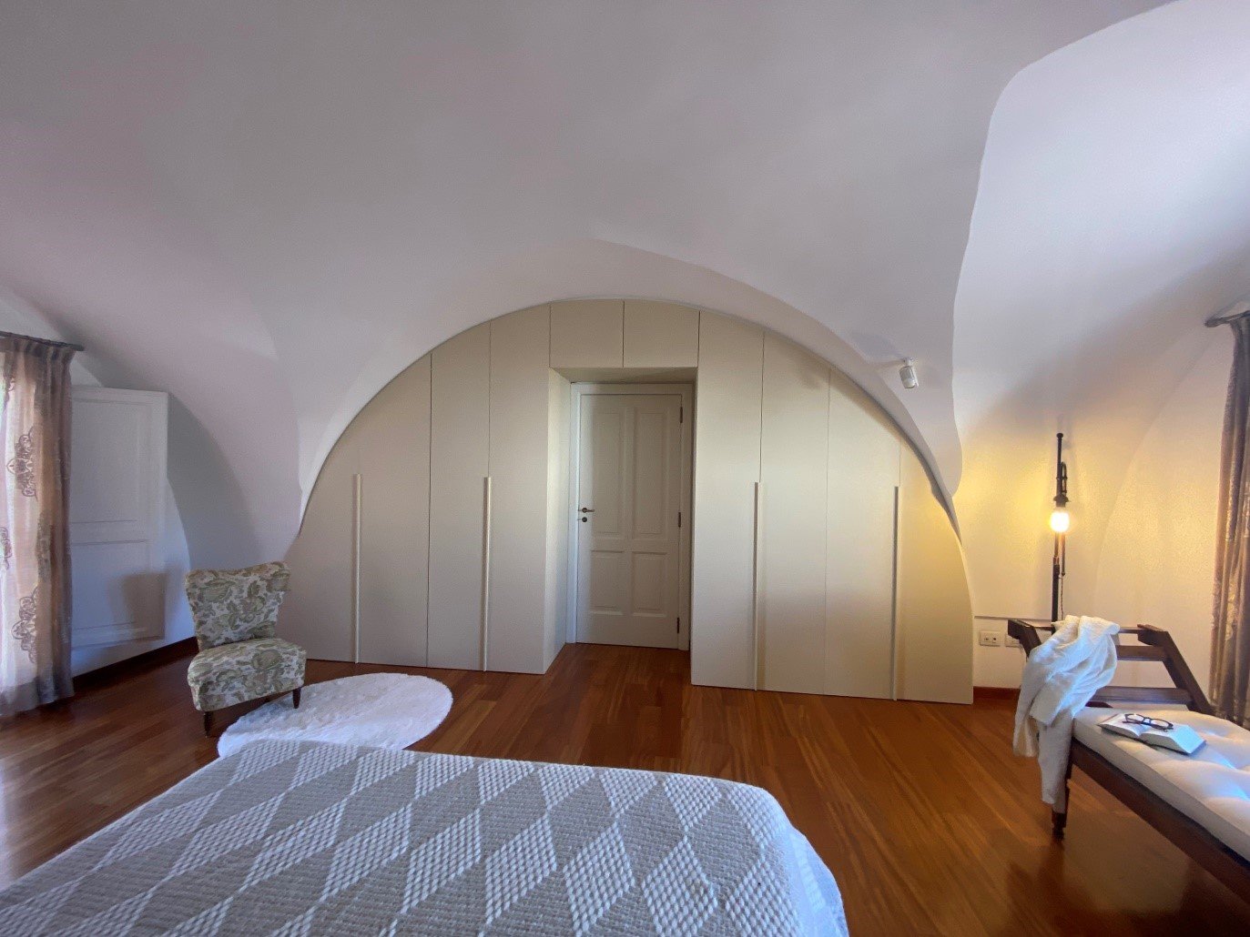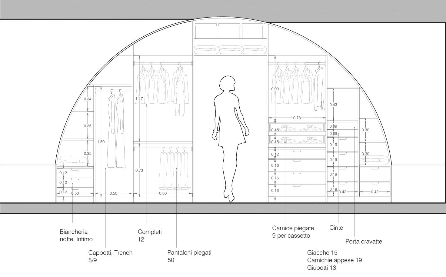 E’ un armadio disegnato su misura in maniera sartoriale. In questo progetto da realizzare in un edificio storico, la particolarità dell’ambiente voltato creava difficoltà nell’utilizzo di arredi industriali, proprio perché non si sarebbe potuto sfruttare tutto lo sazio a disposizione. Bisognava confrontarsi, tra l’altro, con l’ arredo eclettico di grande pregio della casa e risultare al contempo sobrio e funzionale. La grande difficoltà era quella di creare degli spazi contenitivi su un muro che oltre ad avere come vincolo la volta, aveva anche la porta d’ingresso alla camera posizionata al centro del muro. Si è deciso, dunque, di utilizzare una struttura a ponte sagomata che potesse sfruttare ogni centimetro della parete scelta per l’armadio, che ha permesso di diventare quasi un tutt’uno con la struttura architettonica, complice anche la scelta del colore neutro. È stato realizzato in listellare di frassino e laccato a poro aperto e trattate in modo che al tatto risultasse liscio e setoso. Le ante sono a pacchetto per permettere l’apertura massima dei vani contenitori. Per facilitare la visione degli indumenti sono stati inseriti delle strip led che si accendono all’apertura delle ante. Grande attenzione è stata riposta nella scelta dei particolari degli elementi interni.Tutto questo è stato possibile anche grazie alla professionalità dell’artigiano che mi ha seguita e accompagnata in questo piccolo, ma complesso progetto, lavorando in grande sinergia.